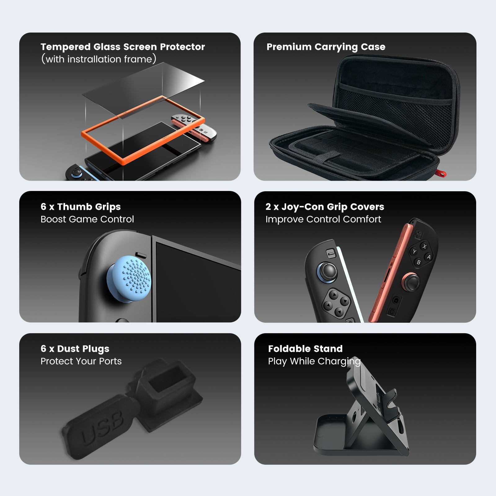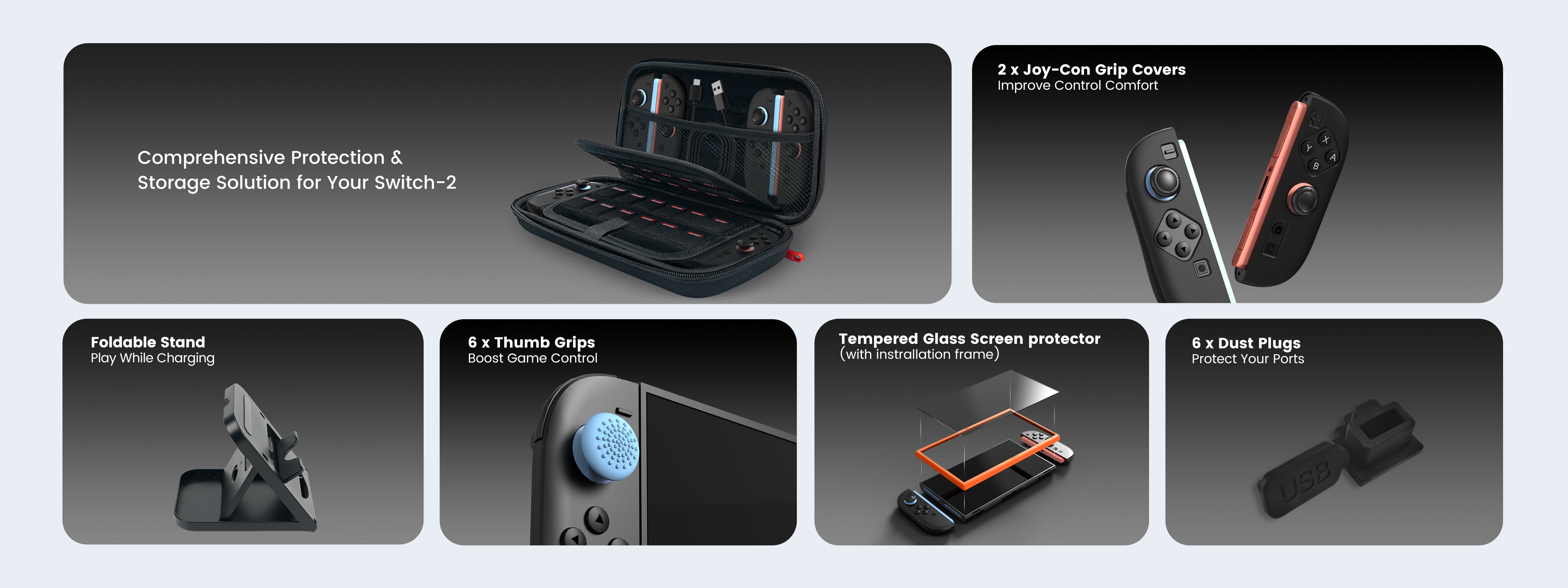 Carrying Case for Nintendo Switch 2 (2025) x1, Foldable Stand x1, Thumb Grips x6, Joy-Con Silicone Grip Covers x2 (1 Blue, 1 Orange), Tempered Glass Screen Protector & Installation Fame x1, Dust Stopper (For 2 USB / 2 Type-C / 1 DP / 1 HDMI Ports)